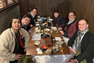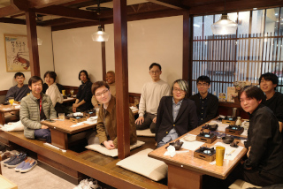 | After a discussion on our recent research topics, they had dinner at a nearby home-style restaurant. Although it was a cold night, they enjoyed eating in a Japanese-style kotatsu set outdoors. |